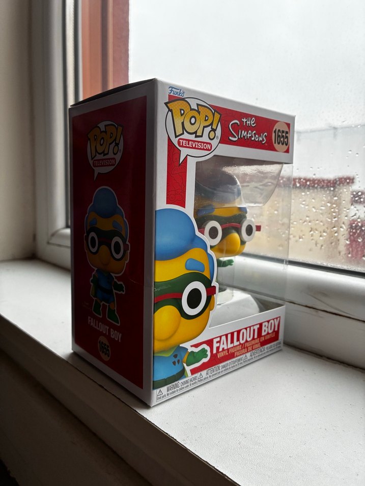 The Simpsons Pop! Television serisinden Fallout Boy figürü, canlı sarı ve mavi renklerle karakterin benzersiz görünümünü yansıtıyor.