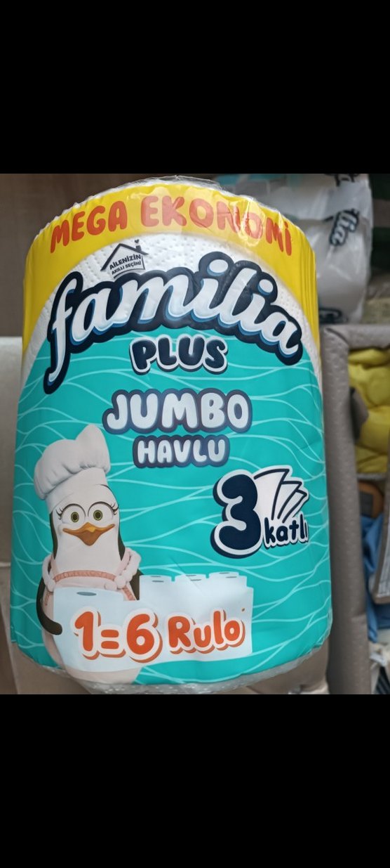 Familia Plus Jumbo 3 katlı kağıt havlu, ekstra emicilik için. Ekonomik ve renkli ambalajıyla dikkat çeker.