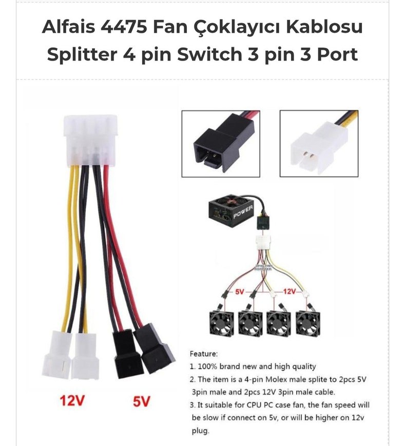 Alfais 4475 Fan Çoklayıcı Kablosu Splitter 4 pin Switch 3 pin 3 Port Molex/4x3-Pin Hız Düşürme Özellikli Fan Çoklayıcı Gürültü ve Soğutma Sorununa Uygun Fiyatlı Çözüm: CB001 Hem fanlarını çoklamak hem de PWM bağlantısına gerek olmadan fan devir hızını düşürmek isteyen kullanıcılar için CB001 dörtlü fan çoklayıcısıdır. iki adet standart hız ve iki adet düşük hız olmak üzere 4 adet fan bağlantısı destekler. Fanlarınızı İster Tam Gaz, İster Sessiz Çalıştırın Kasanızda bulunan iki fanın devir hızını kendi kullanım amacınıza göre ayarlayabilirsiniz. BEYAZ BAŞLIK 12V gerilim vermektedir ve fanlarınız bu gerilimde maksimum devirde çalışarak maksimum soğutma sağlar. SİYAH BAŞLIK 5V'tur ve fanlarınız düşük gerilimde daha yavaş ve sessiz çalışır. Teknik Özellikler Kablo Uzunluğu: 15cm Güç Bağlantısı: 4-pin Molex Fan Bağlantısı: 4x3-pin (2x12V Standart Hız - 2x5V Düşürülmüş Hız)