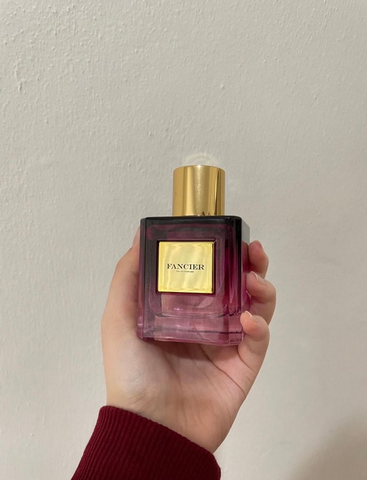 Fancier kadın parfümü, altın kapak ve etikete sahip şık mor şişede, zarif bir koku sunar. Görüldüğü kadar kullanıldı.