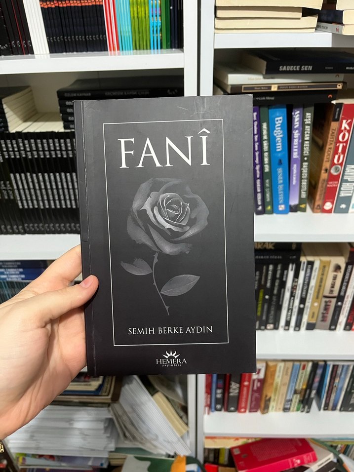 Semih Berke Aydın'ın Fani adlı şiir kitabı, siyah kapak üzerinde detaylı bir gül illüstrasyonuna sahiptir. Hemera yayınevi tarafından basılmıştır.