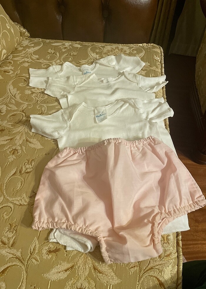 Üç adet fanila ve bir içi naylon bebek külotu 9-12 aylık için Fanila boy 32 cm iki koltuk arası 23 cm