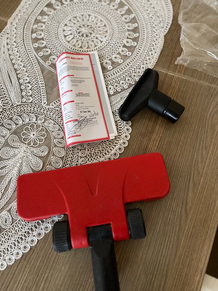 Koyu kırmızı renkte, tekerlekli süpürge başlığı ve ek küçük başlık, farklı yüzeyler için uygundur.