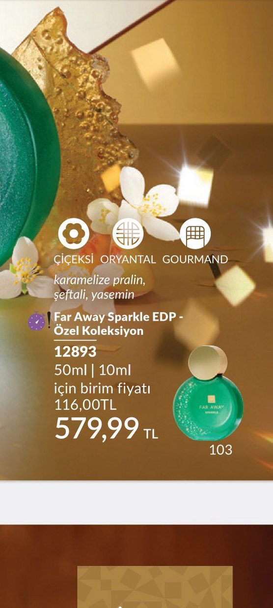Far Away Sparkle EDP, karamelize pralin, şeftali ve yasemin notalarıyla çiçeksi, oryantal ve gourmand kokusuna sahiptir. 50ml şişede sunulur. YILBAŞI ICIN OZEL TASARIM. SINIRLI SAYIDA. SENDE KEŞFET Direk gönderim de sağlanır..