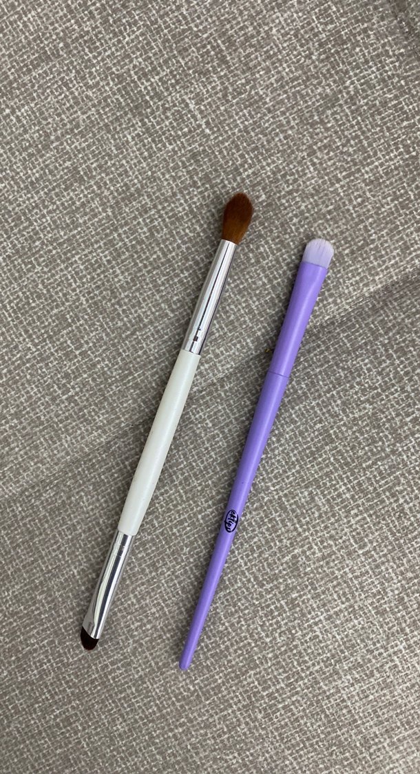 Yumuşak kıllı mor ve beyaz saplı kahverengi uçlu iki makyaj fırçası . Detaylı makyaj için uygundur.