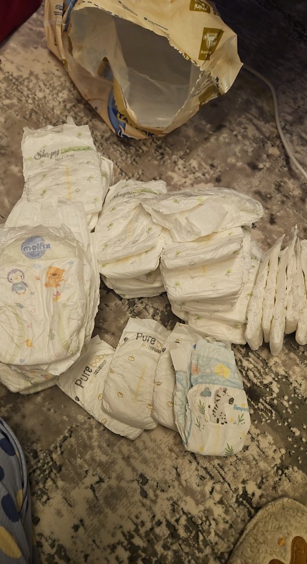 Pure, Molfix ve Pampers markalarından farklı bebek bezleri içeren yumuşak ve emici malzemeye sahip paket. 42 adet slepy 16 adet molfix 3 adet pure baby 1 adet prima