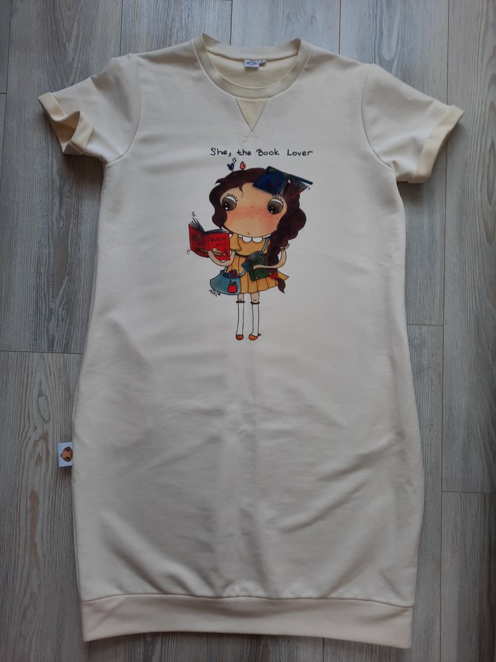 Bej pamuklu yuvarlak yaka bol kesim kısa kollu önü renkli kız baskılı elbise