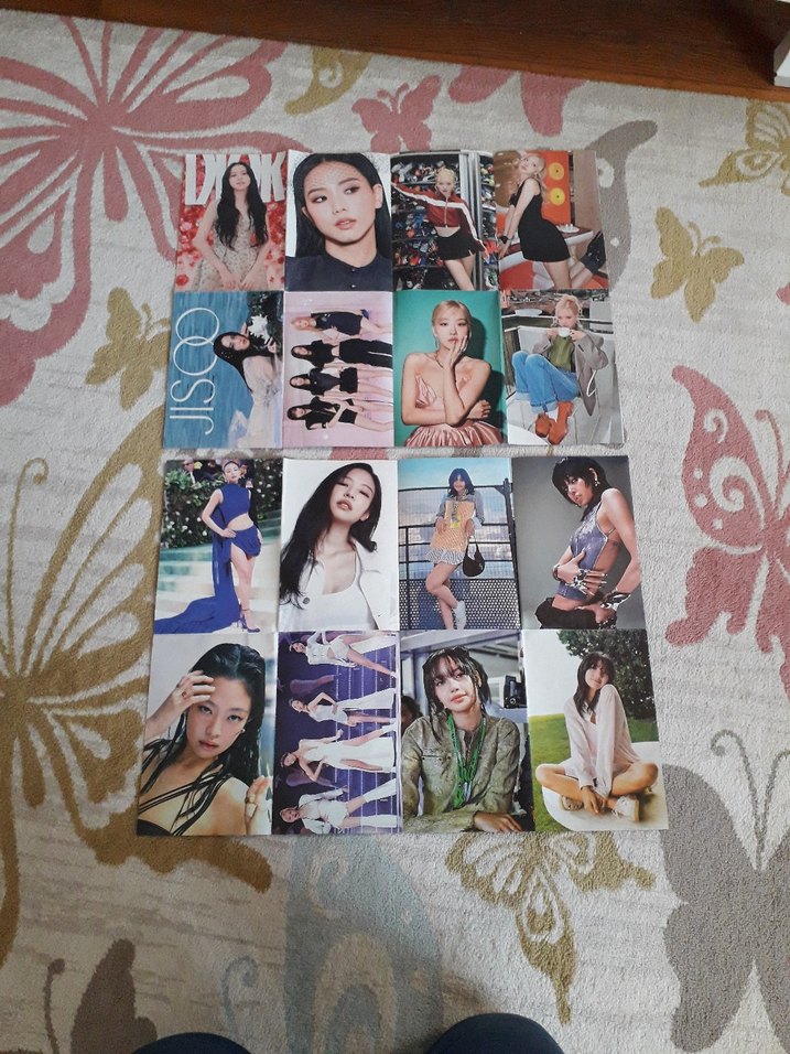 Çeşitli kıyafetler ve pozlardaki K-pop grup üyelerinin renkli fotoğraf kartları, desenli bir zeminde düzenlenmiş.