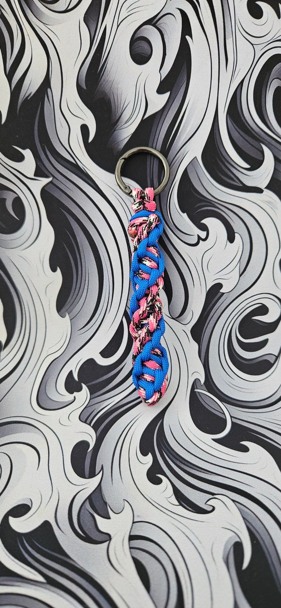 Farklı renklerde ikili DNA zincir tarzında anahtarlık. Paracord 550 ve Paracord 660 iplerinden yüksek kalite ve uzun ömürlü olarak üretilmiştir. Çember karabina ile bitirilen anahtarlık pratik bir kullanım sunar. Çanta süsü olarak da kullanılabilir.