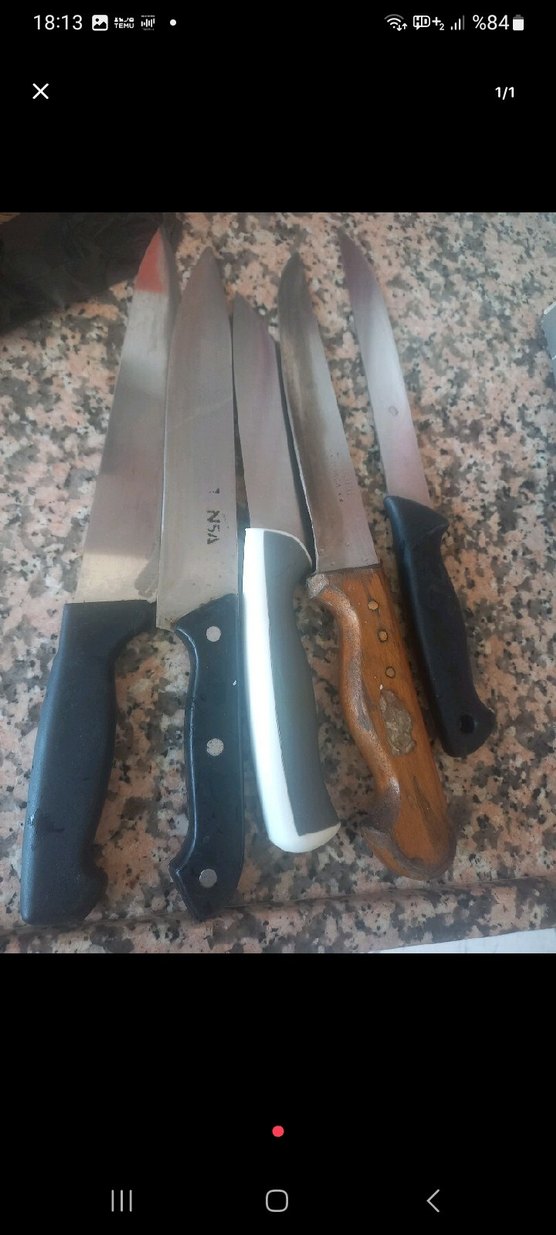 Farklı sap tasarımlarına sahip beş adet mutfak bıçağı takımı. Bir bıçağın üzerinde NSA yazısı bulunur. ️