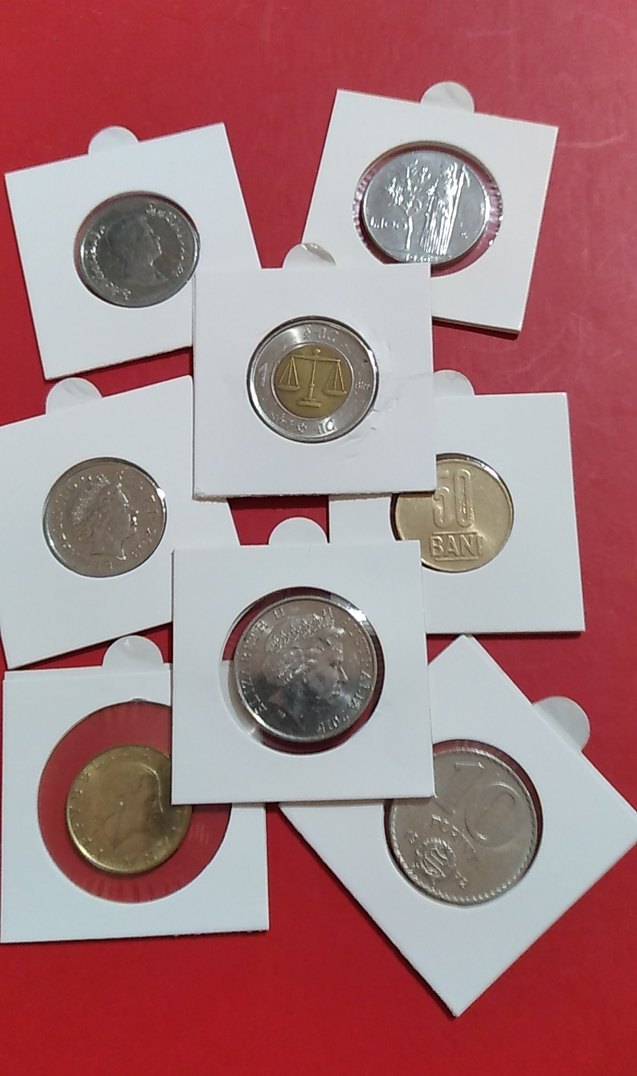 Çeşitli ülkelerden madeni paralar, beyaz koruyucu kılıflarda, kırmızı zemin üzerinde sergileniyor. Paralar farklı boyut ve tasarımlarda.