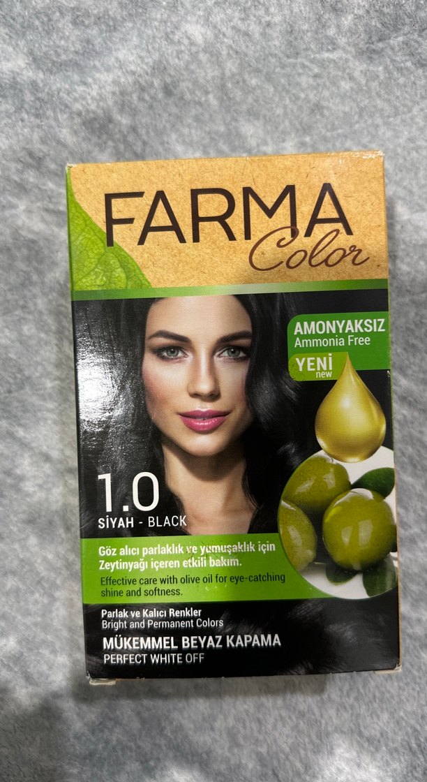 Farma Color siyah saç boyası, zeytinyağı ile etkili bakım sağlayarak parlak ve kalıcı renk sunar. Amonyaksızdır ve mükemmel beyaz kapama sağlar.