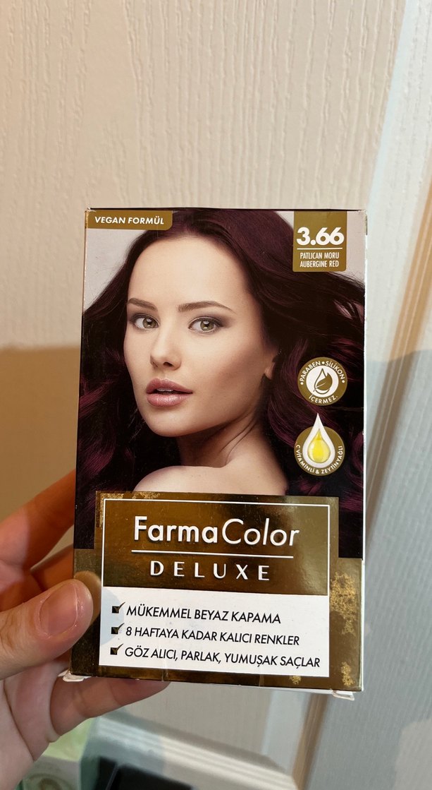 FarmaColor Deluxe 3.66 Aubergine Red saç boyası, vegan formülüyle mükemmel beyaz kapama sağlar. 8 haftaya kadar kalıcı, göz alıcı, parlak ve yumuşak saçlar sunar.