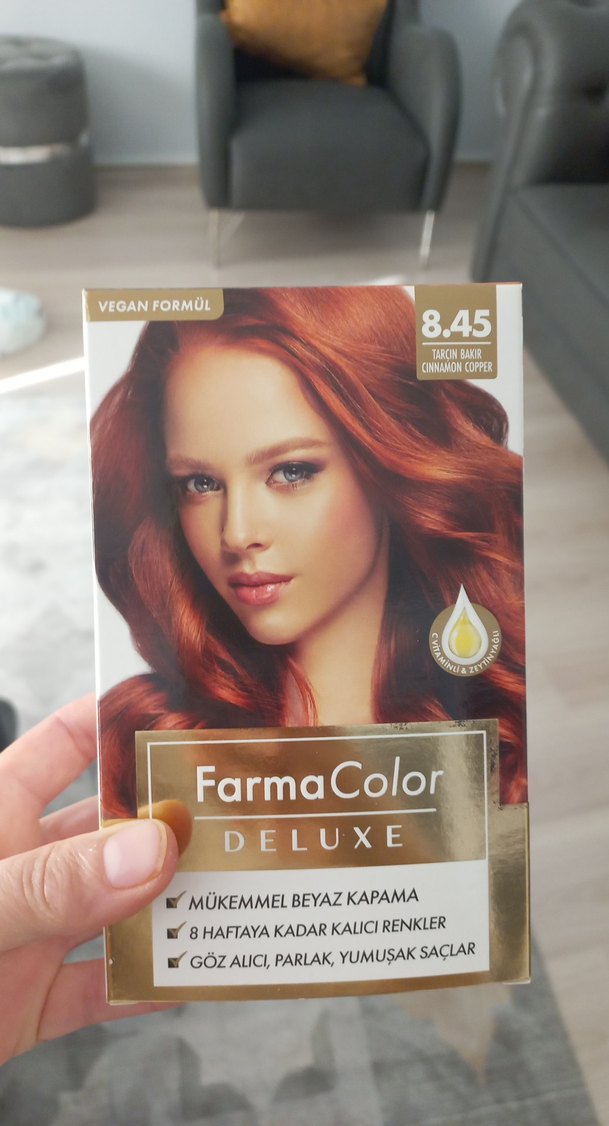 FarmaColor Deluxe 8.45 Tarçın Bakır saç boyası, mükemmel beyaz kapama sağlar. Göz alıcı, parlak ve yumuşak saçlar için vegan formüllüdür, 8 haftaya kadar kalıcı renk sunar.