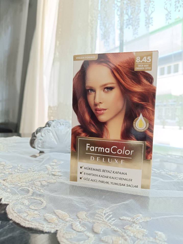 FarmaColor Deluxe 8.45 saç boyası, mükemmel beyaz kapama sağlar ve 8 haftaya kadar kalıcı renk sunar. Saçları parlak, yumuşak ve göz alıcı yapar. Rengi Tarçın Bakır