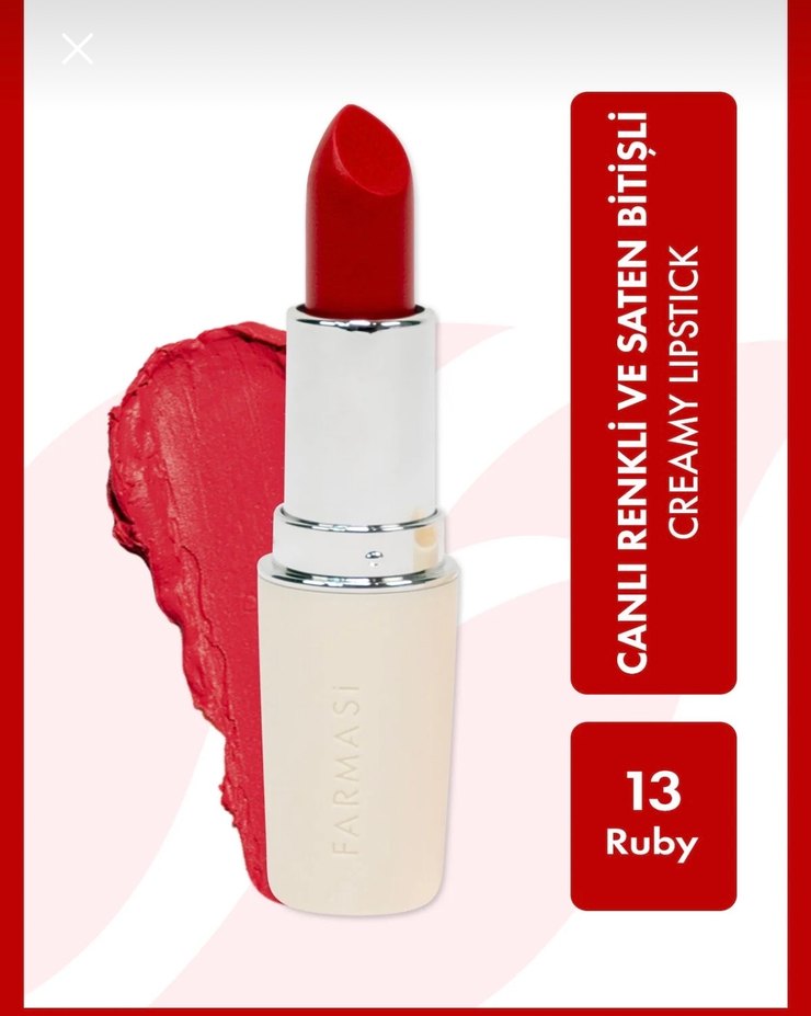 Farmasi 13 Ruby krem ruj, canlı renkli ve saten bitişli açık kırmızı ton sunar. Creamy ruj