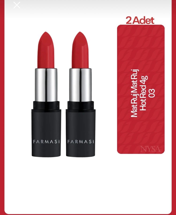 Farmasi markasının 2 adet fiyatıdır .mat kırmızı ruj seti, yumuşak dokusu ile dikkat çeker. Her biri 4g ağırlığındadır. 03 no matte