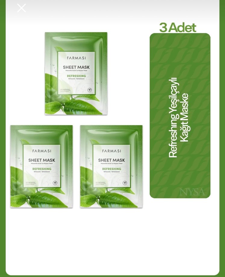 Farmasi'nin yeşil çay özlü ferahlatıcı 3 adet kağıt maskesi, cildinizi canlandırır.