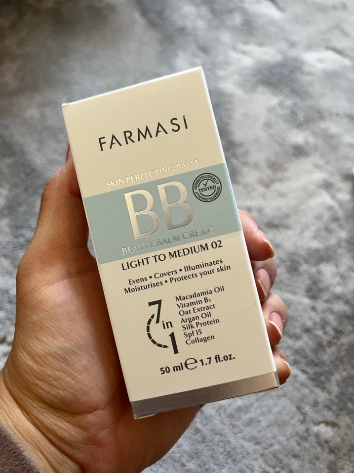 Farmasi BB krem, açık-orta ton, cilt tonunu eşitler, nemlendirir, aydınlatır ve SPF 15 ile korur. Macadamia yağı, B3 vitamini, yulaf özü içerir. 50 ml.