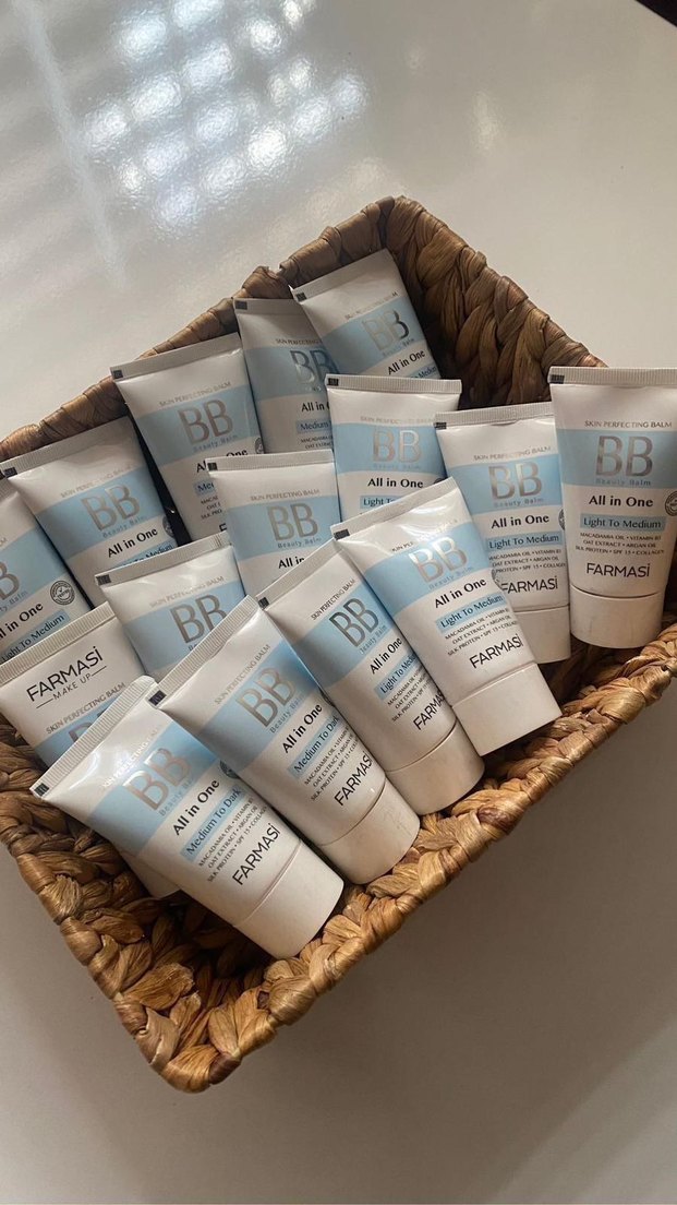 Farmasi All in One BB Krem, bej pastel tonuyla hafif ila orta kapatıcılık sağlar. Cilt bakımı ve makyajı bir arada sunar.
