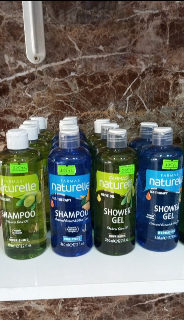 Farmasi Naturelle şampuan ve duş jeli, doğal zeytinyağı içerir. Şampuan saçları besler ve arındırır, duş jeli ise cildi nemlendirir ve canlandırır. Her şişe 360 ml'dir.Aloeveralı şampuan 130 duş Jeli 120tl- Zeytinyağlı şampuan 140 duş jeli 130tl