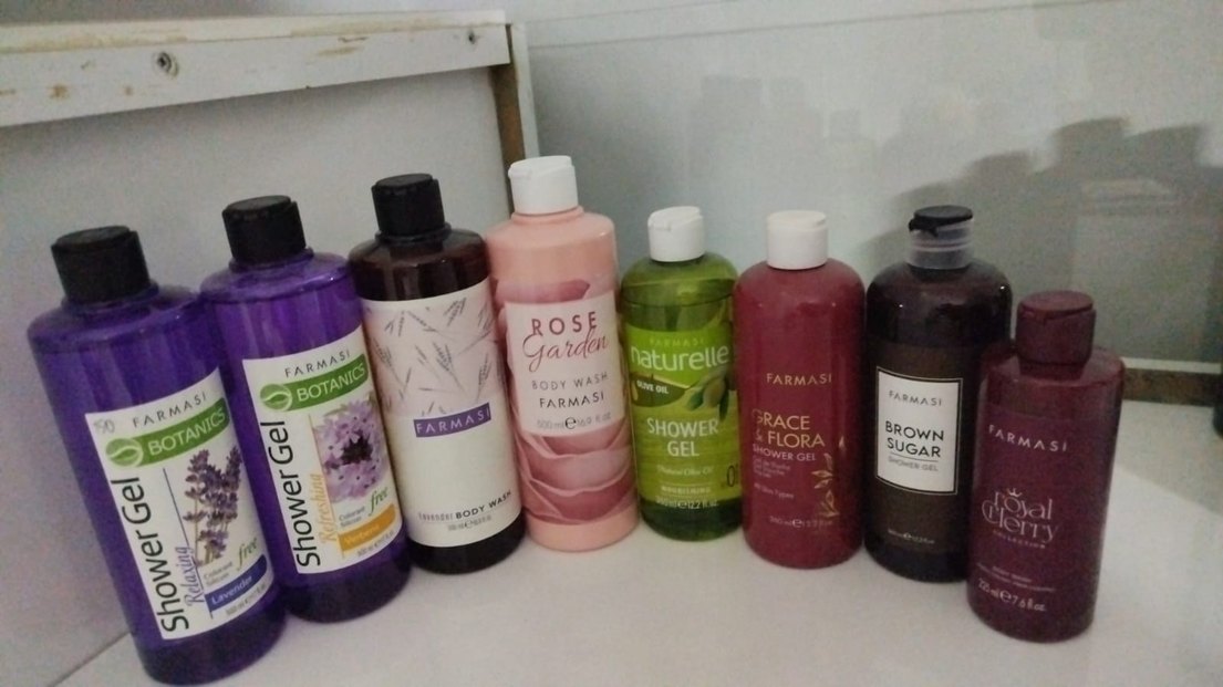 Farmasi markalı, gül ve çiçek kokulu çeşitli duş jellerinden oluşan banyo jelleri seti.