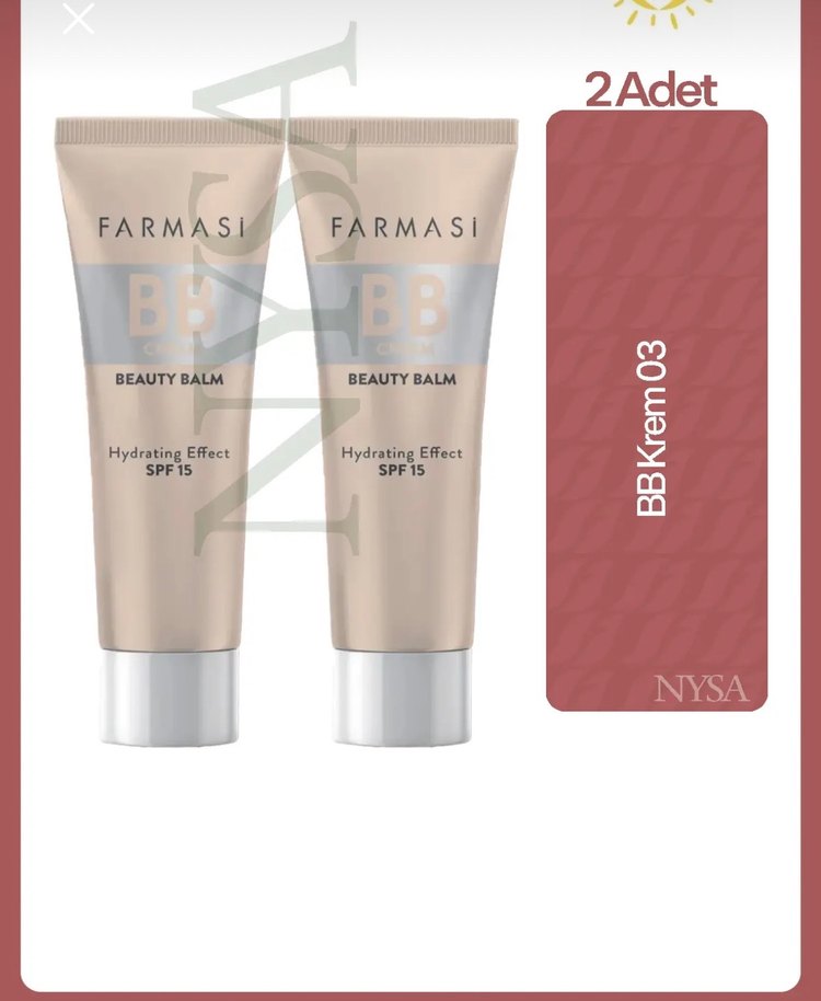 Farmasi Beauty Balm BB Krem bej renkte, nemlendirici etki ve SPF 15 koruma sağlar. İki adet tüp halinde, eşit kapatıcılık ve cilt bakımı sunar. 30 ml bb krem Farmasi 03 2 adet
