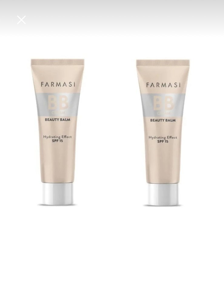 Farmasi BB krem, açık bej rengiyle SPF 15 koruma ve nemlendirme sağlar. Cilt tonunu eşitler ve nemlendirir. 30 ml 2 adet 02 no