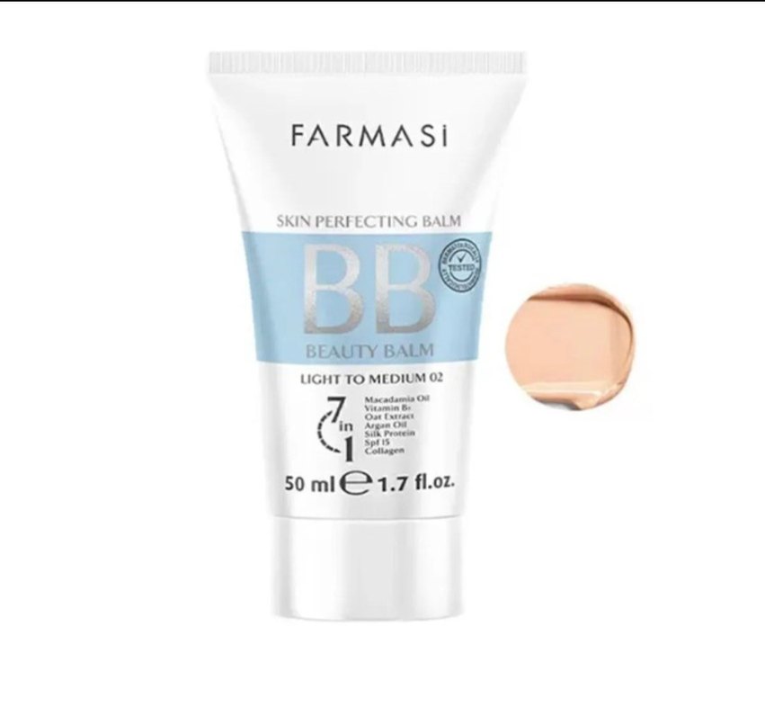 Farmasi BB Krem, açık bej tonunda, makadamya yağı, B5 vitamini, yulaf özü, kolajen ve SPF 15 içeren 7'si 1 arada formülüyle cildi kusursuzlaştırır. 50 ml.