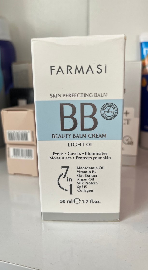 Farmasi BB Krem açık ten renginde, cilt tonunu eşitler, kapatır, aydınlatır, nemlendirir ve SPF 15 ile korur. Macadamya yağı, argan yağı, B3 vitamini, yulaf özü, ipek proteini ve kolajen içerir. 50 ml.