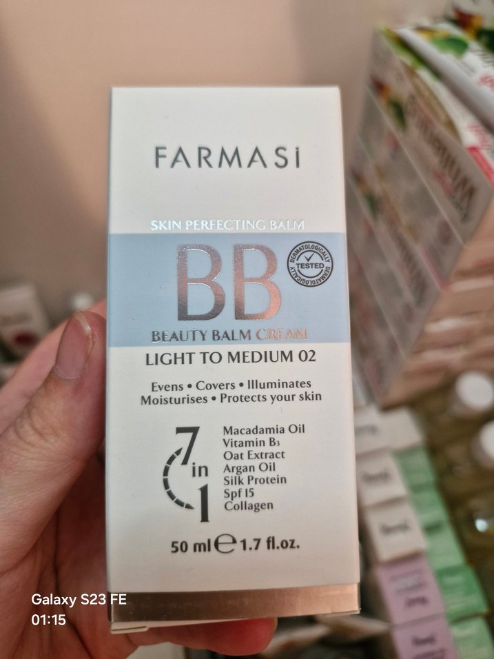 Farmasi BB Krem açık bej renginde, cildi nemlendirir ve SPF 15 ile korur. Cilt tonunu eşitler, kapatır ve ışıldatır. İçeriğinde makadamya yağı, argan yağı, yulaf özü, ipek proteini, vitamin B3 ve kolajen bulunur.