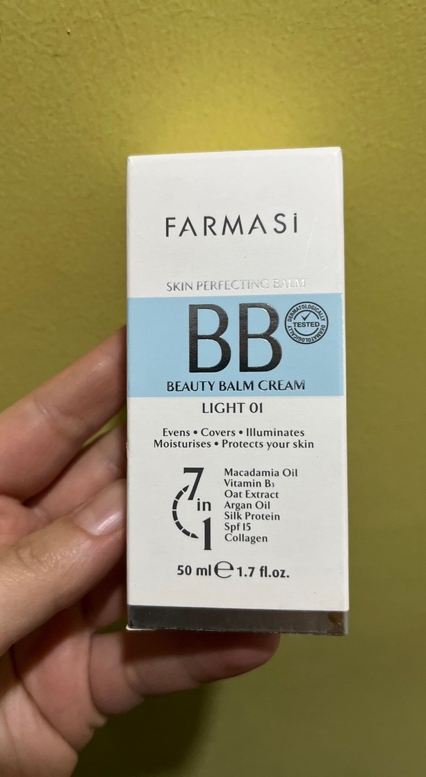 Farmasi BB Krem Light 01 tonu cilt tonunu eşitler, kapatır ve aydınlatır. Macadamia yağı, B5 vitamini, yulaf özü, argan yağı, ipek proteini ve kolajen içerir. SPF 15 ile cildi nemlendirir ve korur. 50 ml.