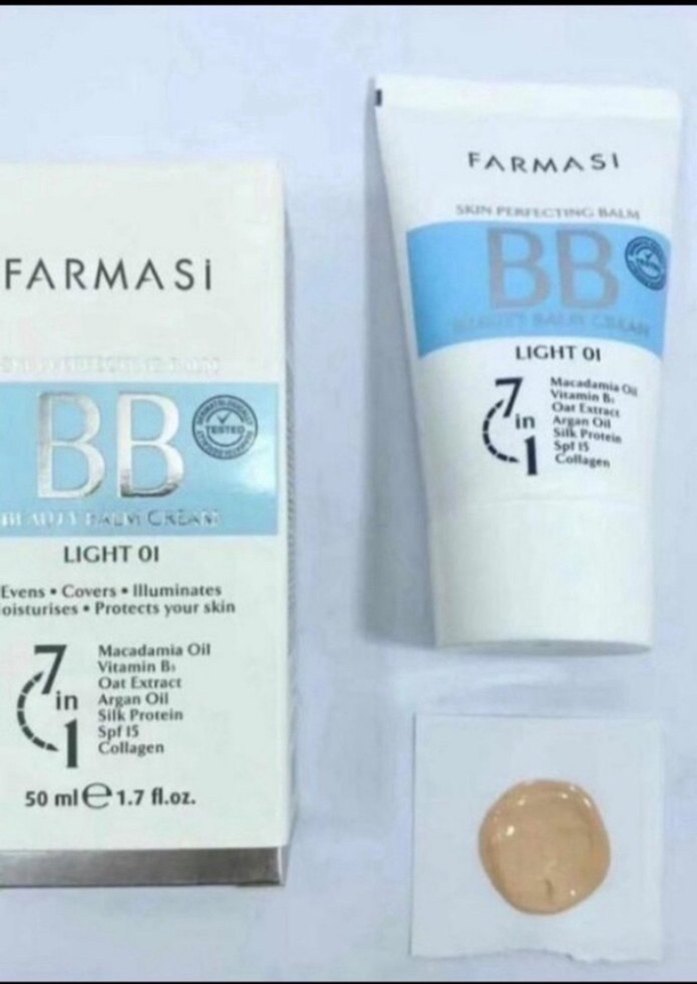 Farmasi BB Krem Light 01 -02 cilt tonunu eşitler, kapatır, aydınlatır, nemlendirir ve SPF 15 ile korur. Macadamia yağı, vitamin B, yulaf özü, argan yağı, ipek proteini ve kolajen içerir. 50ml. İthal üründür (1 Adet fiyatidir)