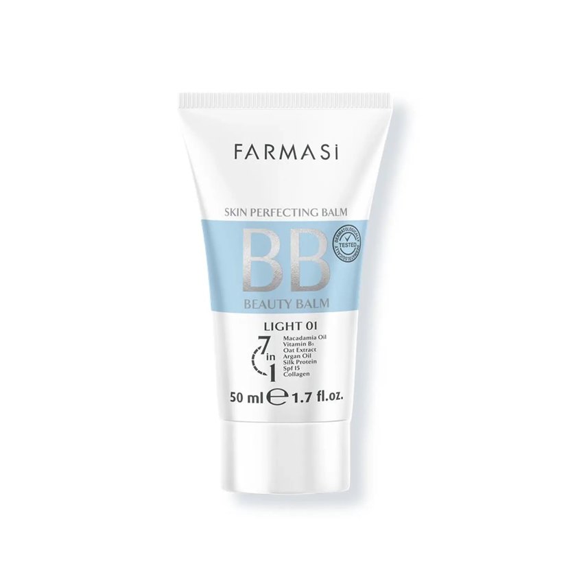 Farmasi BB Krem, macadamia yağı, vitamin E, argan yağı, ipek proteini ve kolajen içeren, cildi kusursuzlaştıran açık bej tonunda 50 ml ürün.