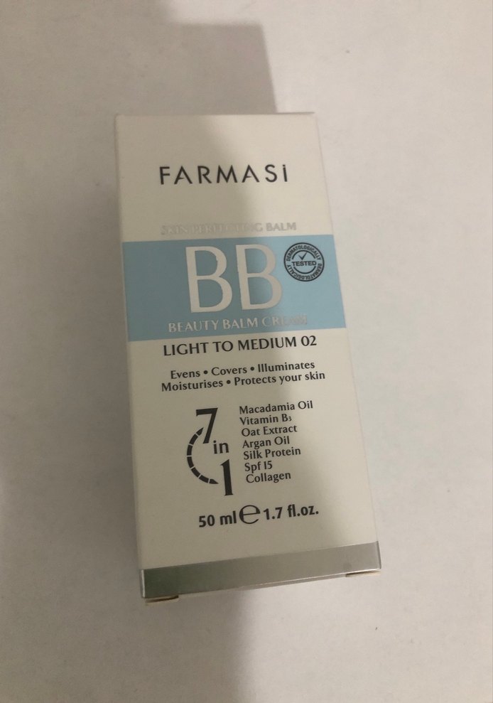 Farmasi BB Krem Light to Medium tonu, cilt tonunu eşitler, kapatır, aydınlatır, nemlendirir ve SPF 15 ile korur. Macadamia yağı, B vitamini, yulaf özü, argan yağı, ipek proteini ve kolajen içerir. 50 ml.