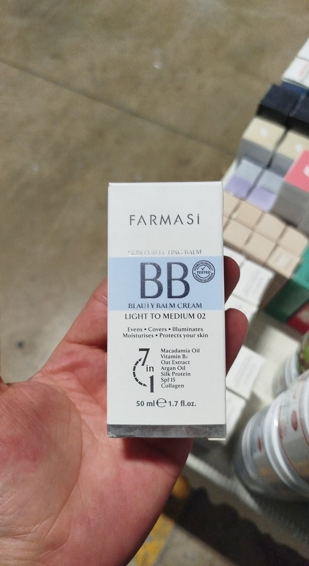 Farmasi BB krem, açık-orta ton, cilt tonunu eşitler, kapatıcıdır, makadamya ve argan yağı ile nemlendirir. SPF 15 ve kolajen içerir.