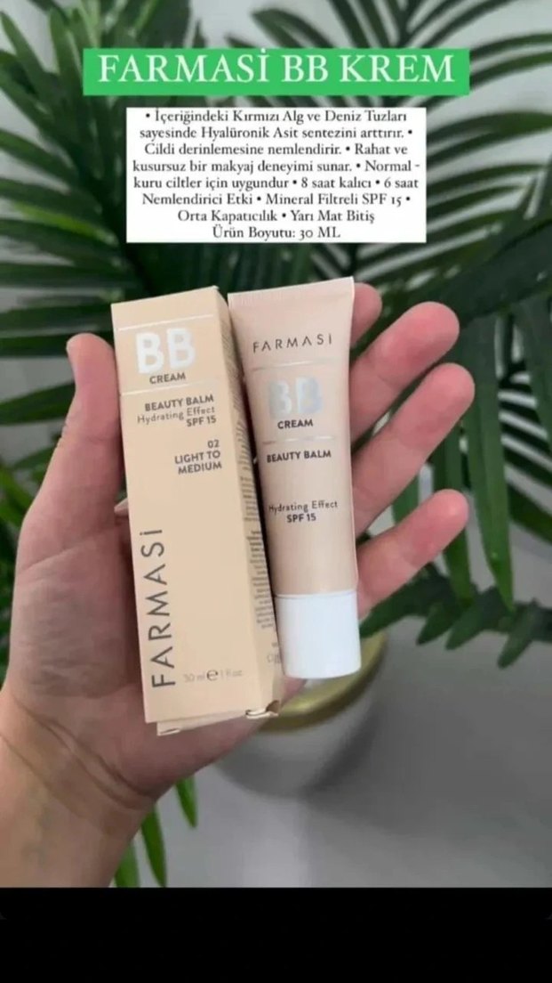 Farmasi BB Krem, orta kapatıcılık ve yarı mat bitiş sağlar. Normal ve kuru ciltleri nemlendirir, SPF15 içerir. Kırmızı alg ve deniz tuzları bulunur. 30 ML.