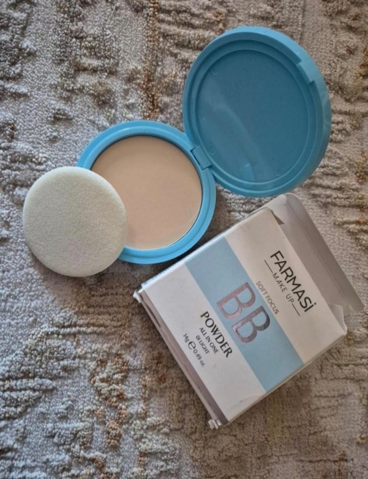 Farmasi BB krem pudra, bej renkte, yumuşak sünger aplikatörle birlikte gelir. Pastel mavi kompakt kutu dahildir.