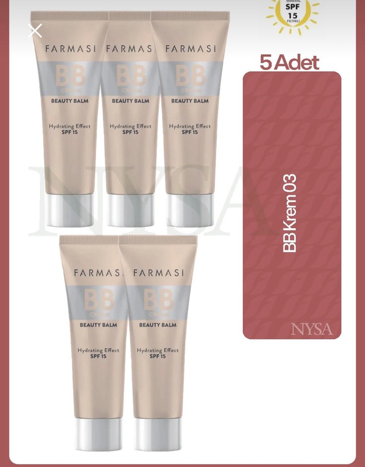 Farmasi BB Krem seti, nemlendirici etkili ve SPF 15 korumalı açık bej renginde beş tüp içerir. Doğal görünüm ve hafif kapatıcılık sağlar. Farmasi 30 ml bb krem 5 adet 03 no