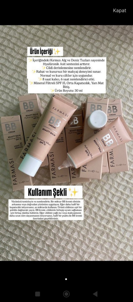 Farmasi BB Krem, orta kapatıcılı ve yarı mat bitişli. Mineral SPF 15 içerir, normal ve kuru ciltlere uygundur. Kırmızı alg ve deniz tuzları ile hyaluronik asit sentezini artırır. 30 ml, 8 saat kalıcı, 6 saat nemlendirir.