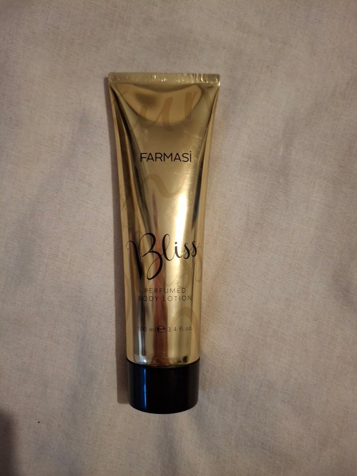 Farmasi Bliss parfümlü vücut losyonu, parlak altın tüpte nemlendirici bakım sunar.