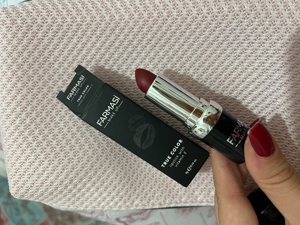 Farmasi marka, koyu bordo renkte ve E vitamini içeren ruj. Kutusunda marka ismi ve dudak izi bulunur.