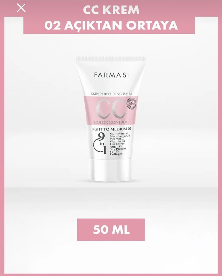 Farmasi CC Krem, açık ten rengine uygun 50ml hacminde, cilt kusurlarını düzelten ve renk kontrolü sağlayan kremdir. 02 no