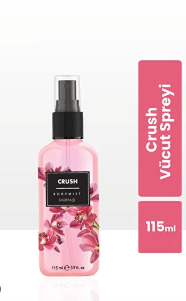 Farmasi Crush vücut spreyi, 115 ml, çiçek desenli şişede ferahlatıcı koku sağlar.