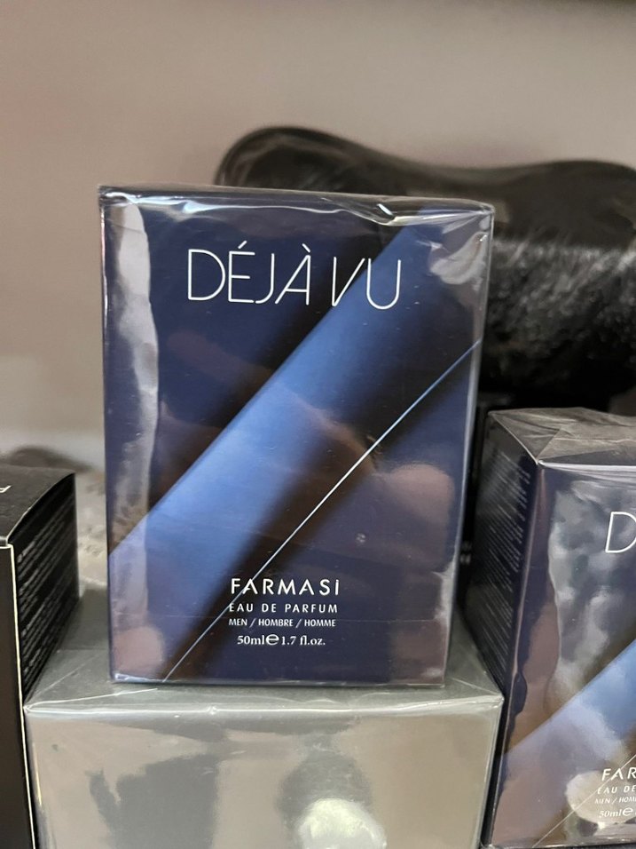 Farmasi Déjà Vu erkekler için Eau de Parfum, koyu lacivert ve çağdaş Paris tarzında, 50 ml şişede sunuluyor.