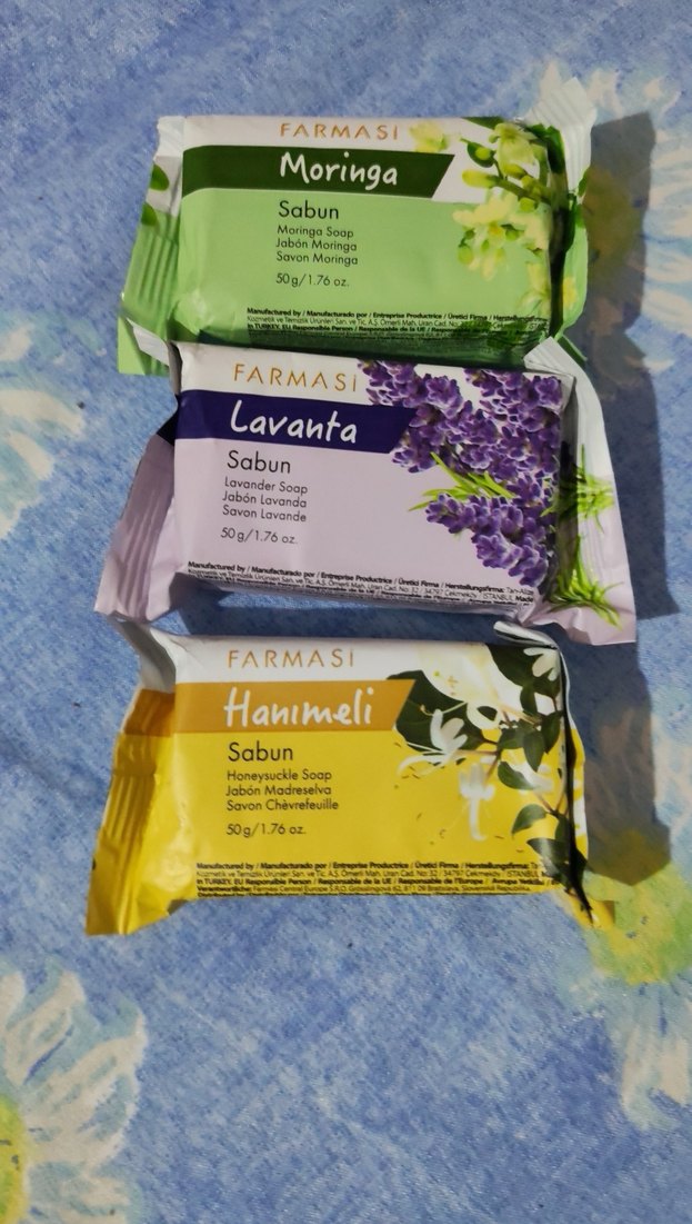 Farmasi sabun seti; Moringa, Lavanta ve Hanımeli kokularından oluşur. Her biri 50g ağırlığında, doğal koku ve temizlik sağlar. Tane fiyatıdır.