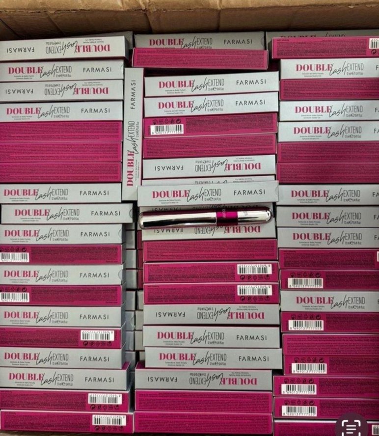 Farmasi Double Lash Extend maskara açık pembe renkte, kirpiklere hacim ve uzunluk sağlar. Şık ambalajı ve belirgin marka yazısı bulunur.