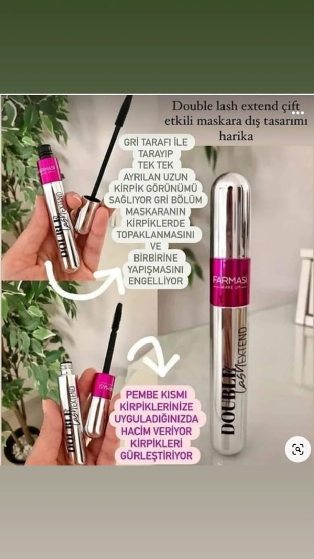 Farmasi Double Lash Extend maskara, çift uçlu fırçasıyla kirpikleri tek tek ayırır ve topaklanmayı önler. Pembe kısmı kirpiklere hacim ve belirginlik verir. ️