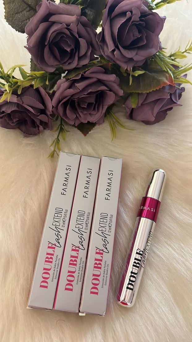 Farmasi Double Lash Extend maskara, açık pembe renkte, kirpikleri belirginleştirir ve canlı bir görünüm sağlar.