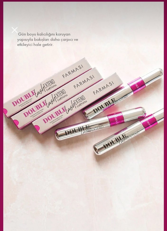 Farmasi Double Lash Extend maskara, gün boyu kalıcılık sağlar ve kirpikleri etkileyici hale getirir.